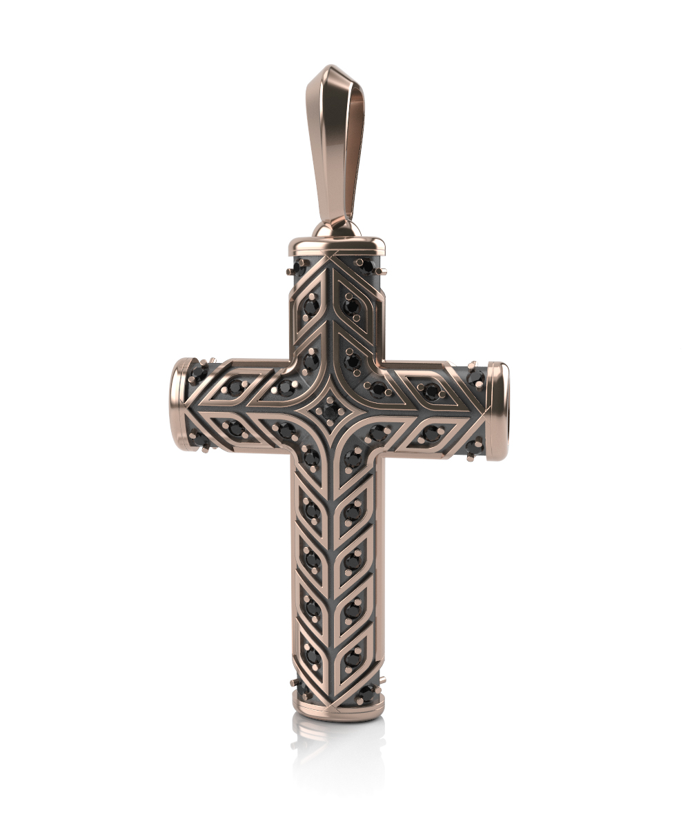 Стильная подвеска-крест, выполненная из красного золота 585 пробы, украшенная черными фианитами.