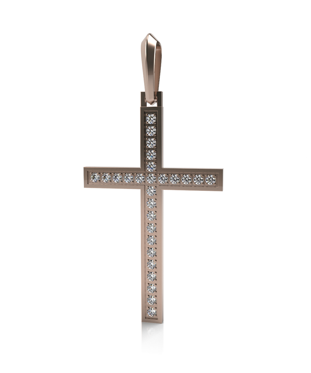 Стильная подвеска-крест, выполненная из красного золота 585 пробы, украшенная фианитами.
