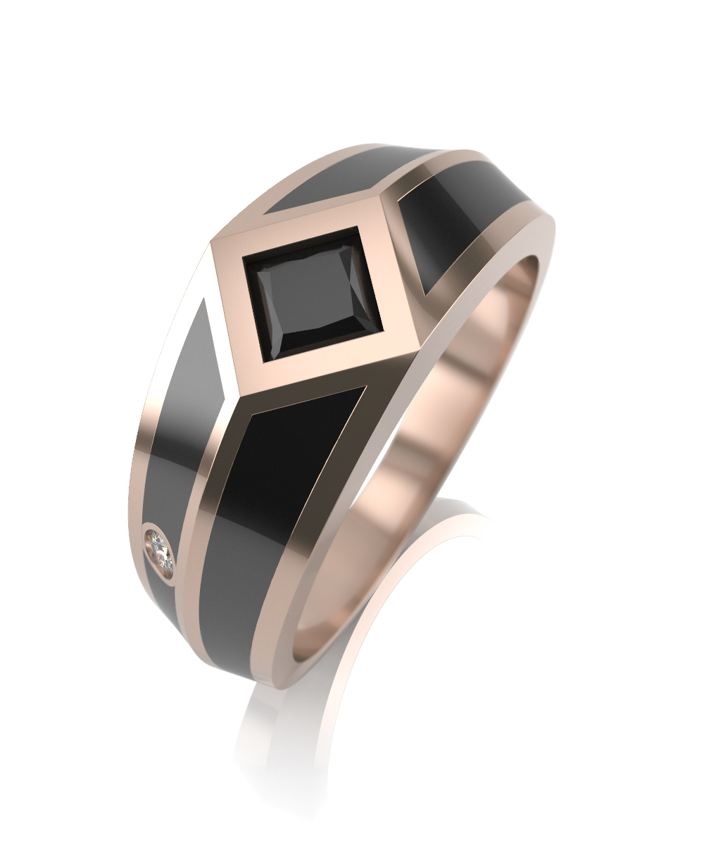 Стильное кольцо-печатка, выполненное в сочетании красного золота 585 пробы с черной керамикой и украшенное фианитом.