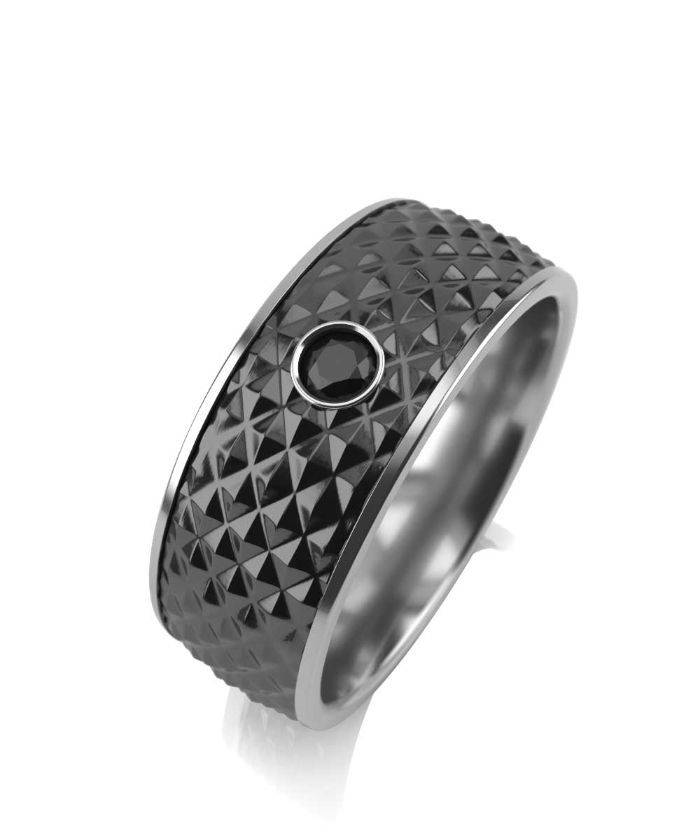Стильное широкое кольцо из серебра 925 пробы с керамикой черного цвета и вставкой из черного фианита.