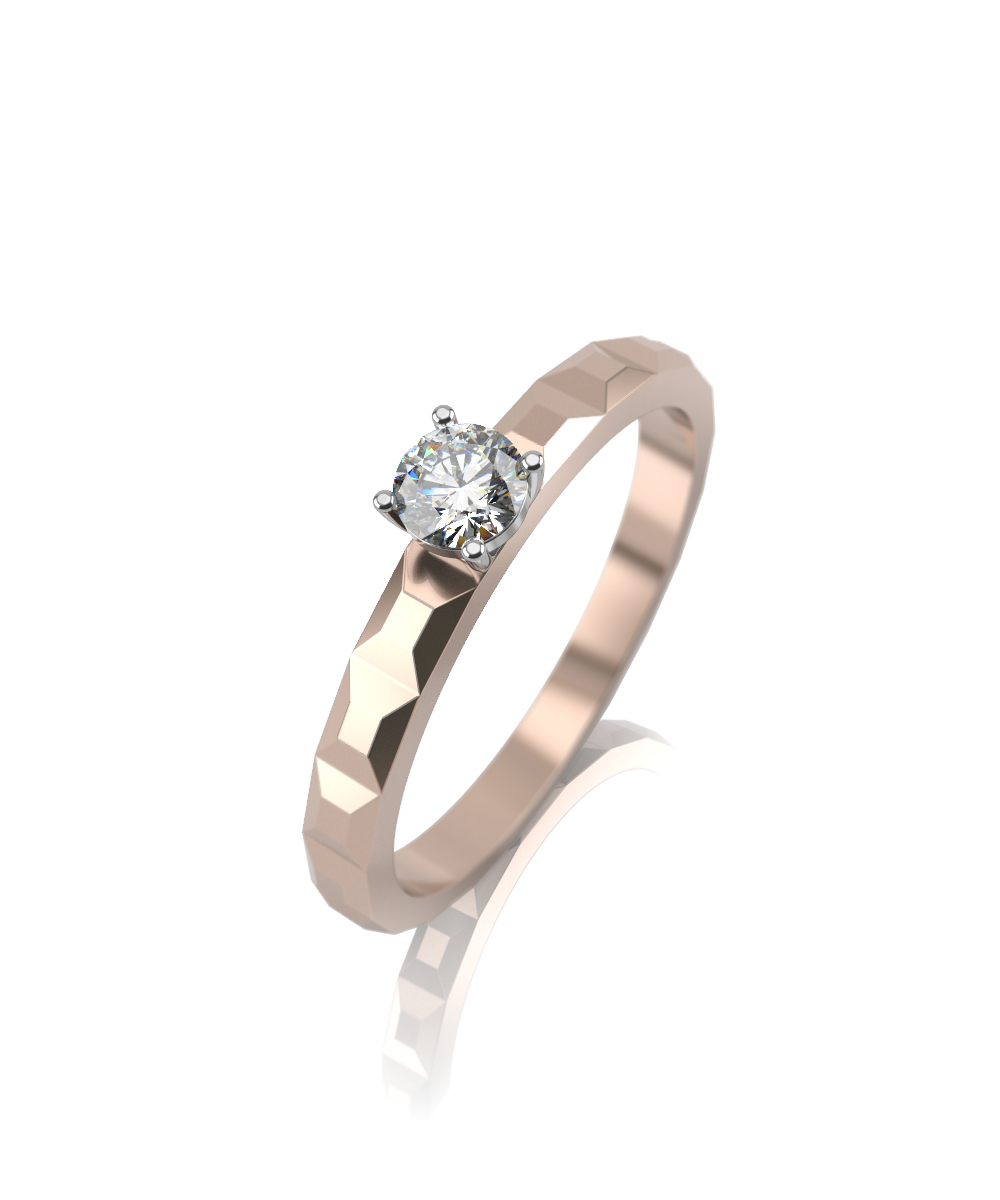 Сочетание алмазной обработки поверхности кольца с ярким бриллиантом смотрится очень эффектно.
