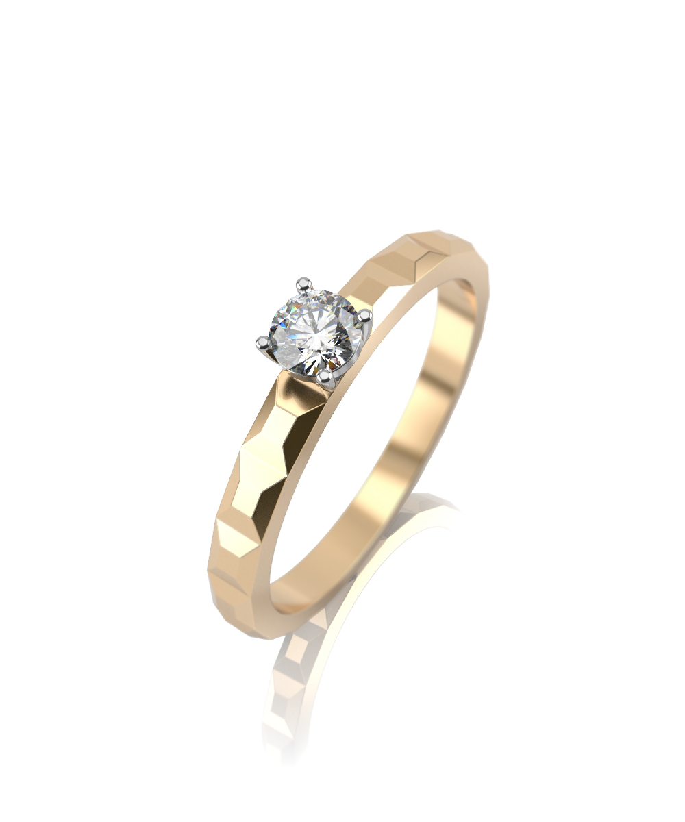 Сочетание алмазной обработки поверхности кольца с ярким бриллиантом смотрится очень эффектно.