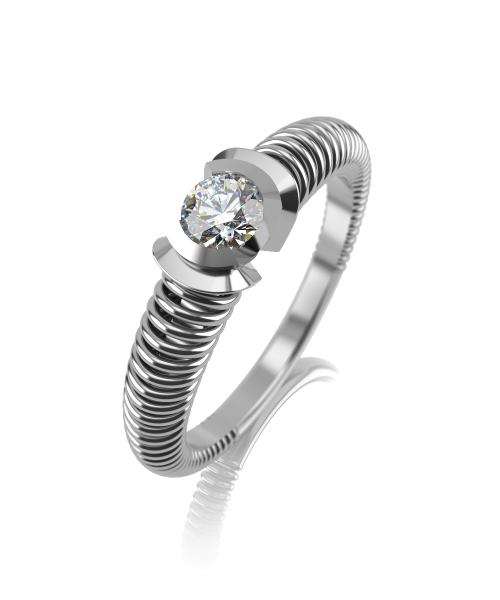 Стильное помолвочное кольцо из белого золота 585 пробы с бриллиантом и уникальной рельефной обработкой поверхности.