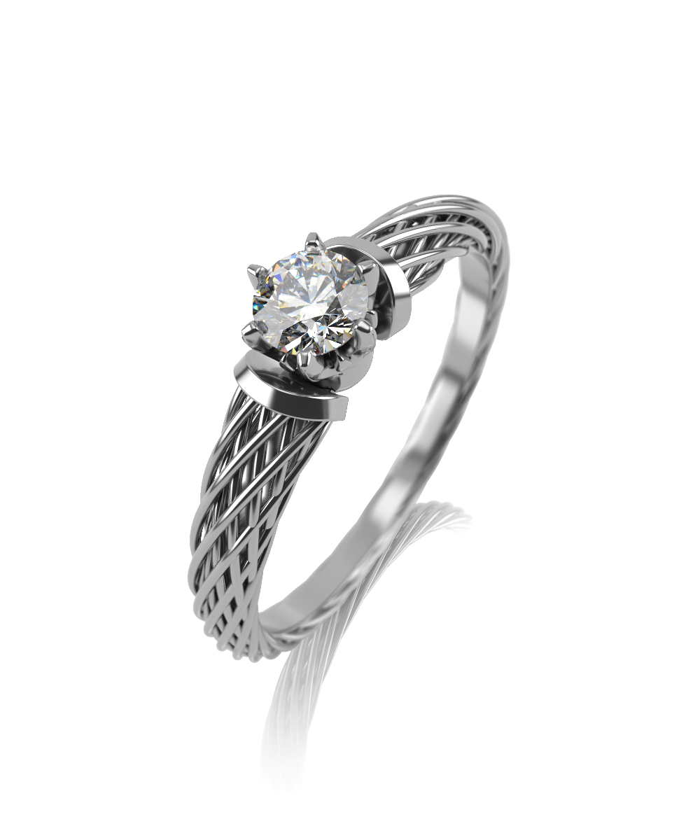 Стильное помолвочное кольцо из белого золота 585 пробы с бриллиантом и уникальной рельефной обработкой поверхности.