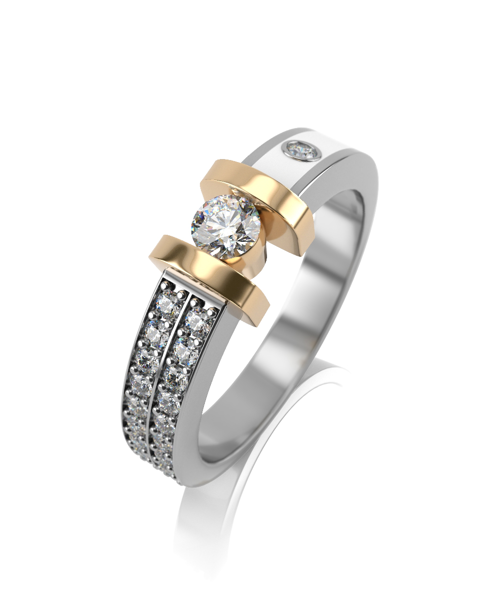 Основа кольца выполнена в белом золоте, а каст, в котором крепится крупный центральный бриллиант - в желтом.