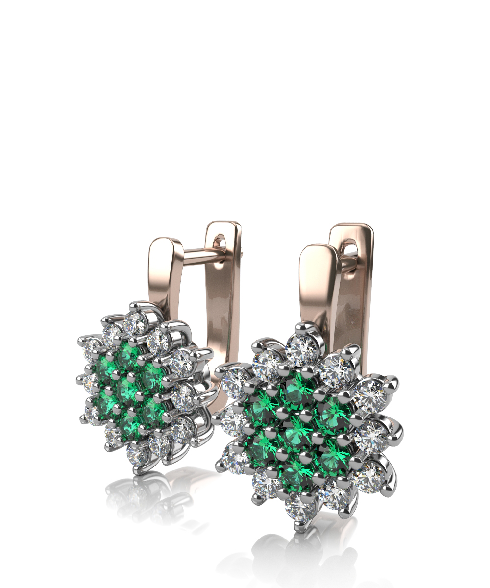 Роскошные серьги с натуральными изумрудами и бриллиантами, выполненные в сочетании красного и белого золота 585 пробы.