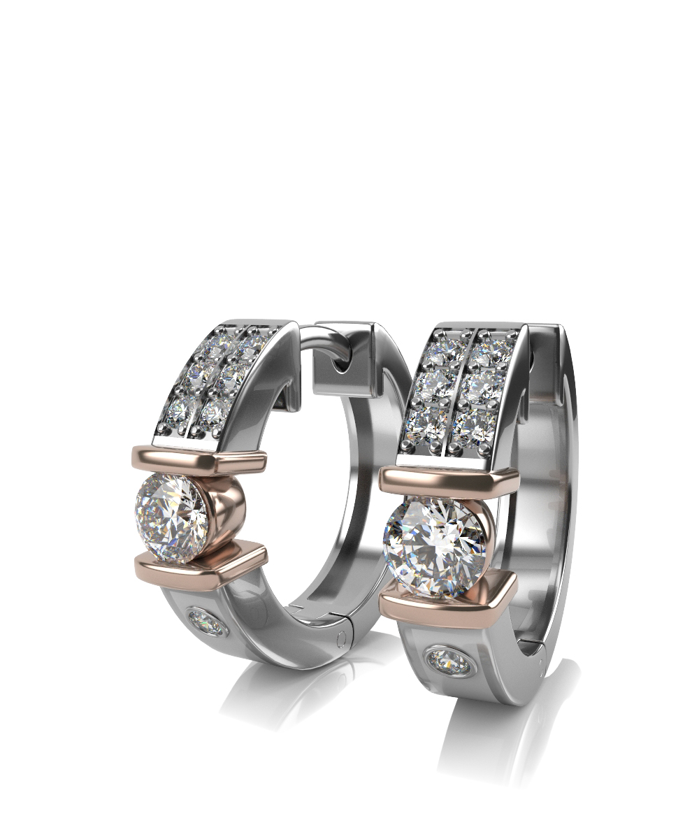 Основа серег выполнена в белом золоте, а каст, в котором крепится крупный центральный бриллиант - в красном.