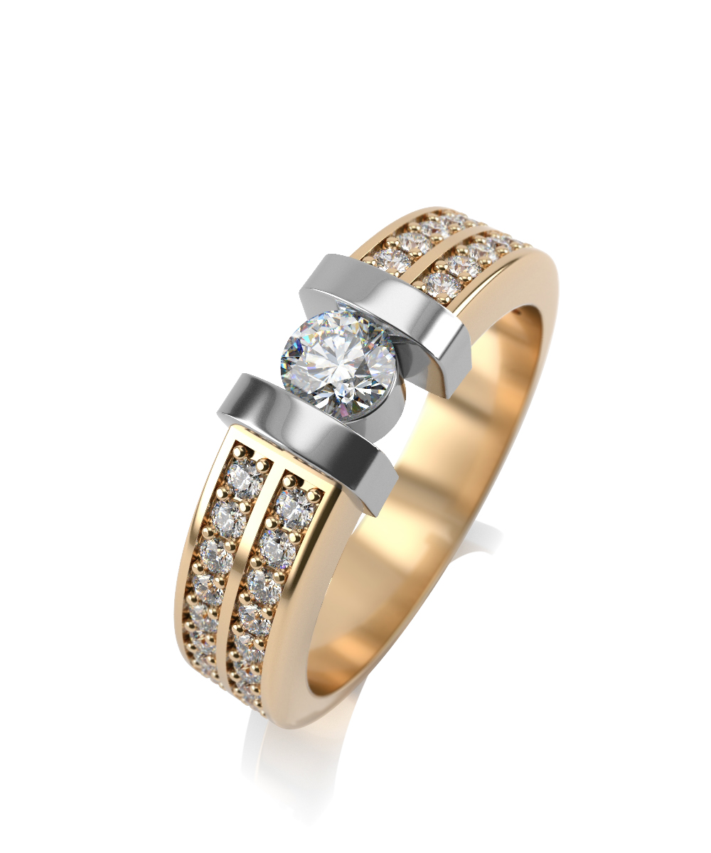 Основа кольца выполнена в желтом золоте, а каст, в котором крепится крупный центральный бриллиант - в белом.