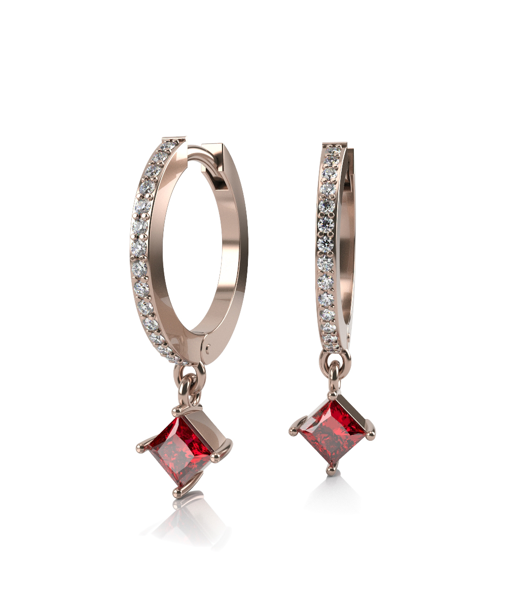 Стильные серьги из красного золота 585 пробы, украшенные бриллиантами и гранатами.