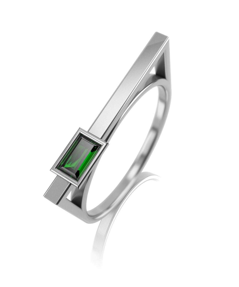 Кольцо из белого золота 585 пробы, украшенное хризолитом.
