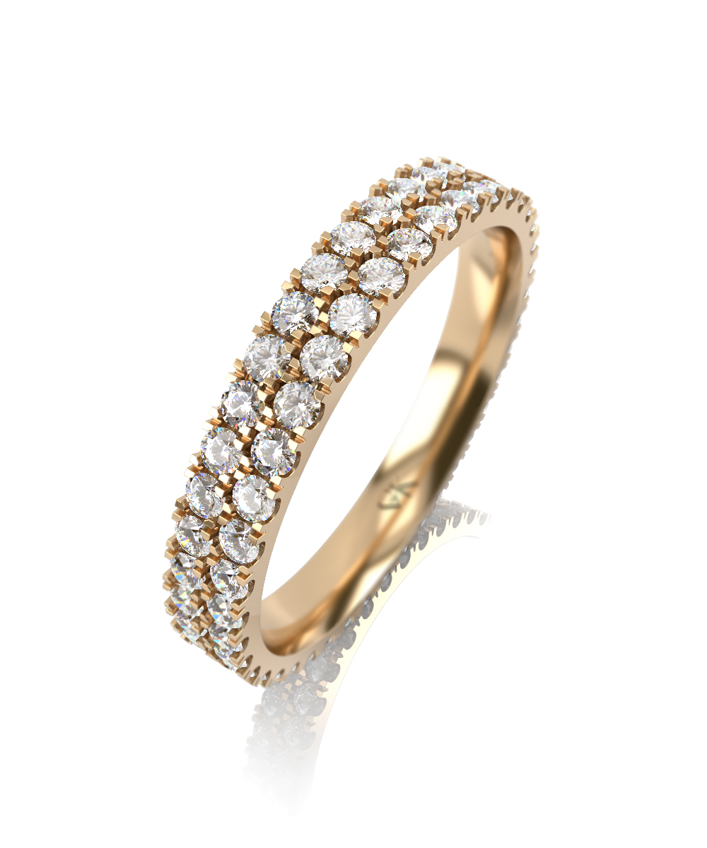 Кольцо из желтого золота 585 пробы, украшенное дорожкой из бриллиантов.