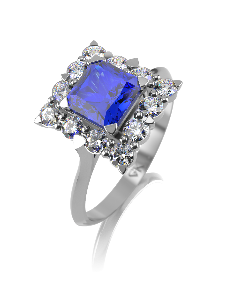 Кольцо из белого золота с сапфиром и выращенными бриллиантами