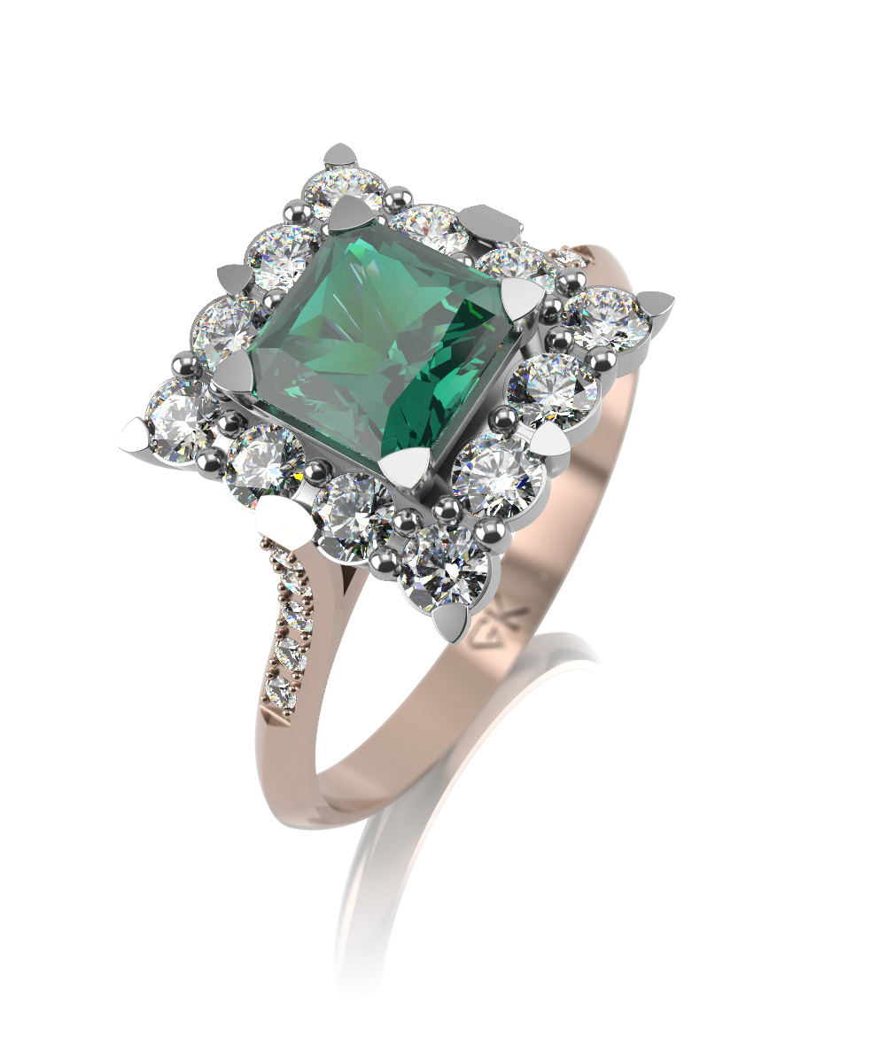 Изысканное кольцо в сочетаниибелого и красного золота с изумрудом и выращенными бриллиантами.
