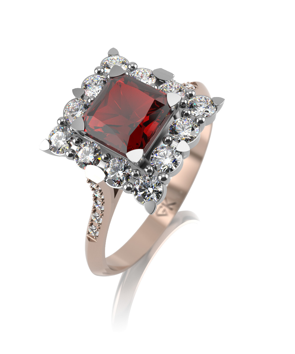 Изысканное кольцо в сочетании белого и красного золота с рубином и выращенными бриллиантами.