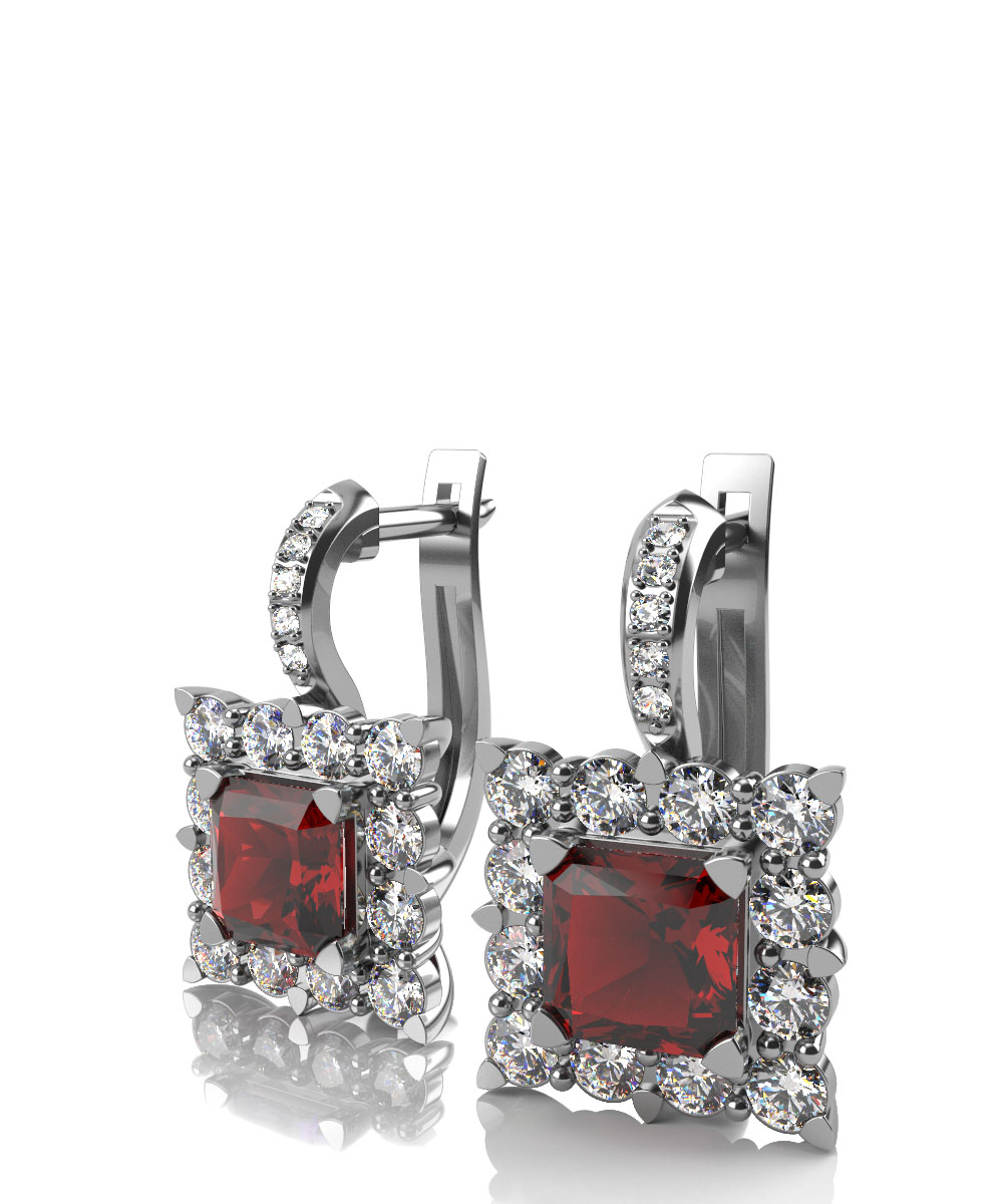 Изысканные серьги из белого золота с рубинами и выращенными бриллиантами.